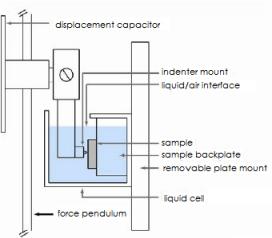 NanoTest在納米力學(xué)測(cè)試系統(tǒng)上加入了液體池模塊,可以對(duì)完全浸入液體池中的樣品進(jìn)行納米壓痕、納米劃痕和磨損測(cè)試,摩擦傳感器也可使浸入樣品進(jìn)行摩擦測(cè)量。該液體池采用現(xiàn)有的擺設(shè)計(jì),水平加載在流體測(cè)試中具有以下優(yōu)勢(shì):a、浮力恒定,b、恒定表面張力,c、液體不經(jīng)過電容器之下。