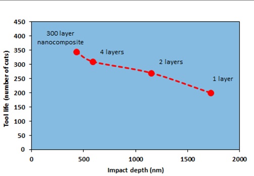 在最近發(fā)表的一篇論文中,Bouzakis比較了多層PVD TiAlN涂層系統(tǒng)的性能。這種系統(tǒng)是延長(zhǎng)涂層材料壽命的有效方法。納米沖擊測(cè)試被證明是優(yōu)化分層系統(tǒng)的有力輔助。銑削硬化鋼的刀具壽命(切削次數(shù))與最大沖擊深度進(jìn)行了比較。圖2顯示了各種系統(tǒng)的切削性能與抗沖擊性之間的良好相關(guān)性。