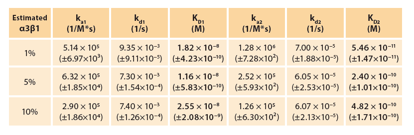 通過(guò)MP-SPR確定表面結(jié)合肽(LXY30)與流動(dòng)的細(xì)胞外囊泡(SKOV-3)的相互作用(圖1)。使用TraceDrawer?軟件的“兩位點(diǎn)”結(jié)合模型分析相互作用,將其解釋為兩組肽分子與一個(gè)細(xì)胞外囊泡結(jié)合。本文對(duì)三種假設(shè)的電動(dòng)汽車(chē)進(jìn)行了評(píng)估,其中表面α3β1整合素的含量被評(píng)估為每顆??偟鞍椎?%,5%或10%。所有三個(gè)病例的親和力表明SKOV-3顆粒與表面結(jié)合的LXY30配體的強(qiáng)結(jié)合(圖2,表1)。在本研究中,僅測(cè)量了三種濃度的分析物,然而,通常建議測(cè)量五種或更多濃度來(lái)評(píng)估親和力和動(dòng)力學(xué)。