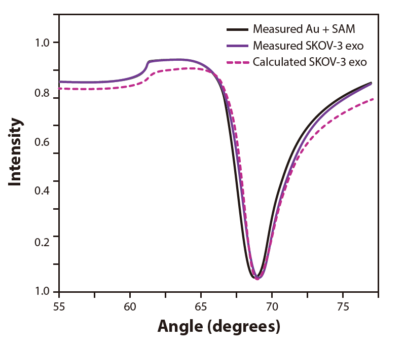 在MP-SPR實(shí)驗(yàn)之前,BioNavis標(biāo)準(zhǔn)金傳感器載玻片被非原位涂覆一層自組裝的生物素化烷烴硫醇(11-巰基-1-十一醇,MuOH)單層(SAM)。進(jìn)入儀器后,在運(yùn)行緩沖液TRIS-EDTA (25 mM TRIS, 1mM EDTA, pH 8.0)中設(shè)置基線信號(hào),然后在兩個(gè)通道中注射鏈霉親和素。生物素化LXY30肽僅在一個(gè)通道中引入,留下第二個(gè)通道作為參考,不含肽。從最低濃度到最高濃度(3.4 × 109、5.7 × 109和1.7× 1010顆粒/ml)順序注射,將卵巢癌細(xì)胞外囊泡SKOV-3加載到兩個(gè)通道中。使用TraceDrawer?for MP-SPR Navi?和MP-SPR Navi?LayerSolver對(duì)數(shù)據(jù)進(jìn)行分析。
