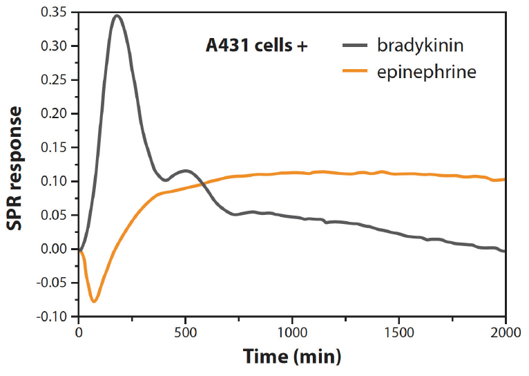 由于其在生理過程中的核心作用,gpcr作為新藥物化合物的靶點被廣泛研究。結(jié)合全SPR曲線峰的動態(tài)角度(PAP)和強度(PMI)變化,MP-SPR用于將活細(xì)胞中活化的gpcr分離成亞型特異性信號通路,而不使用拮抗劑或其他反應(yīng)調(diào)節(jié)劑。