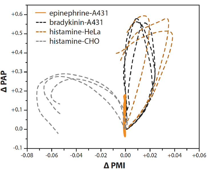 圖4:雙參數(shù)PMI-PAP反應(yīng)譜,其中PAP(峰值角位置)反應(yīng)與PMI(峰值最小強度)反應(yīng)相對應(yīng),顯示不同激動劑和細(xì)胞系的明確可區(qū)分模式。