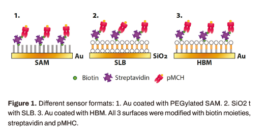 所有3層都用生物素修飾,通過(guò)鏈霉親和素介導(dǎo)的結(jié)合,使生物素- pmhc復(fù)合物(裝載NY-ESO-I157?165抗原的HLA-A0201單體)固定化。以PEG-SAM表面為參照,以功能性SLB和HBM為仿生平面基質(zhì),測(cè)定t細(xì)胞受體結(jié)合情況。